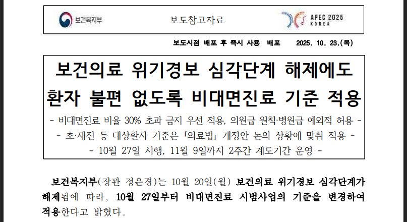 오늘부터 시행되는 비대면진료 기준 변경은 보건의료 위기경보 해제에 따른 조치입니다.